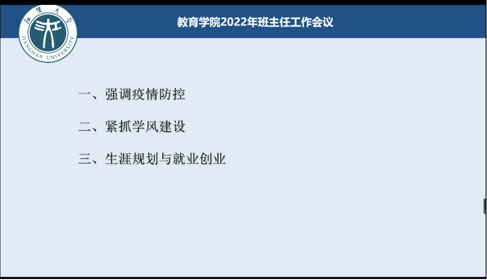 党委副书记邹茸、全体班主任和辅导员参加了此次会议。会议由学办主任石兰主持。