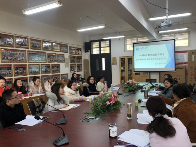 在J04A413进行了2018级小学教育专业研究生论文开题答辩会。出席本次答辩的专家有:周冬祥、兰军、邓志祥、刘平秀、严月娟。除了此次参加答辩的专家与五名学生,2019级小学教育专业的教育硕士也积极参与观摩旁听。