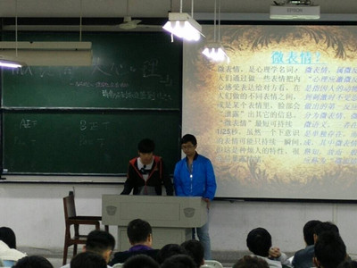 2014年10月30日晚8:30,NAME心理学社于J04A108开展了主题为“微表情,大心理”的会员活动。本次活动由NAME心理学社学习部14级干事甘财和刘博两位同学负责,各部门相关人员和社团会员皆到场参与。