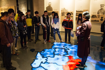 天空中下着大雨,但是阻挡不了我们参与活动的热情,学生上午9点30进入辛亥革命博物馆,颇具气势的大型浮雕《共和之基》映入眼帘。整座雕塑包括起义背景、武昌首义、创建共和三个部分,涵盖“同盟会的成立”、“黄花岗起义”、“保路运动”和“武昌起义”等元素。随后进入展厅,电子“动态时局图”显示的“条约墙”场景配合浮雕、壁画、、多媒体等为厚重的辛亥百年史拉开帷幕。