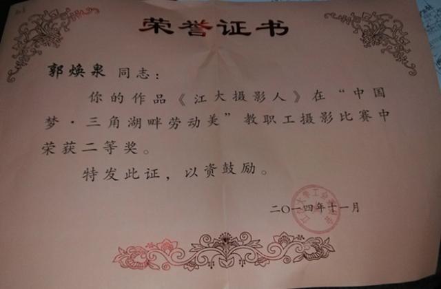 2014年11月,OB彩票(中国)唯一官方网站 教师郭焕泉的摄影作品《江大摄影人》在“中国梦三角湖畔劳动美”教职工摄影比赛中荣获二等奖。