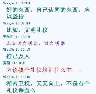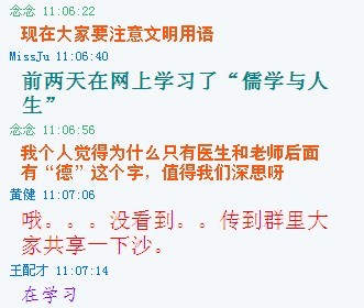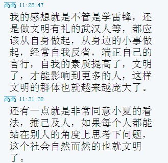 青年理论学习小组利用网络优势,集中以“做文明有礼的武汉人”为主题在QQ讨论组中就“说文明话、做文明事、当文明人、为文明武汉、礼仪之城增光添彩”进行了激烈的讨论。