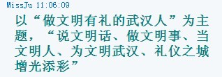 “你我文明一小步,社会文明一大步”。我们相信,只要我们每一个人从自身做起,从小事做起,说文明话,做文明事,一个现代文明的大都市将呈现在我们每一个武汉人眼前!